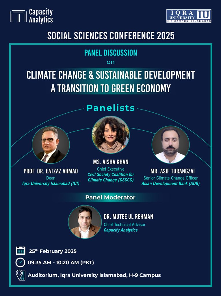 Among its key themes was the growing urgency of climate change and the need for a just and equitable transition to a green economy. Recognizing the increasing vulnerability of climate-affected nations like Pakistan, the conference provided a platform for experts to share insights, research findings, and practical strategies for climate adaptation, sustainable development, and green financing.